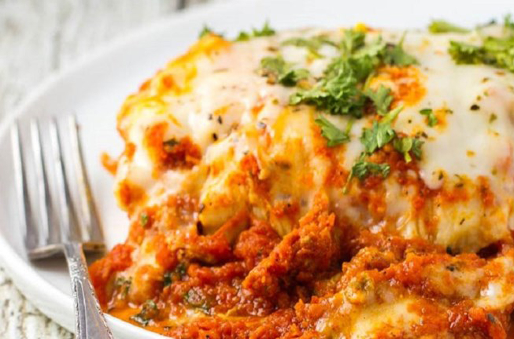 Pentru montare, întinde o cană și jumătate de sos de carne pe fundul unei tavi de copt). Aranjează 5 paste lungi pe sosul de carne. Întinde o jumătate din amestecul de brânză riccota. Deasupra așează o treime din feliile de brânză mozzarella. Adaugă din nou cu lingura o cană și jumătate de sos de carne peste mozzarella și presară un sfert de cană de parmezan. Repetă straturile, iar deasupra pune mozzarella și parmezanul rămas. Acoperă cu folie, iar pentru a preveni lipirea, asigura-te că folia nu atinge brânza.